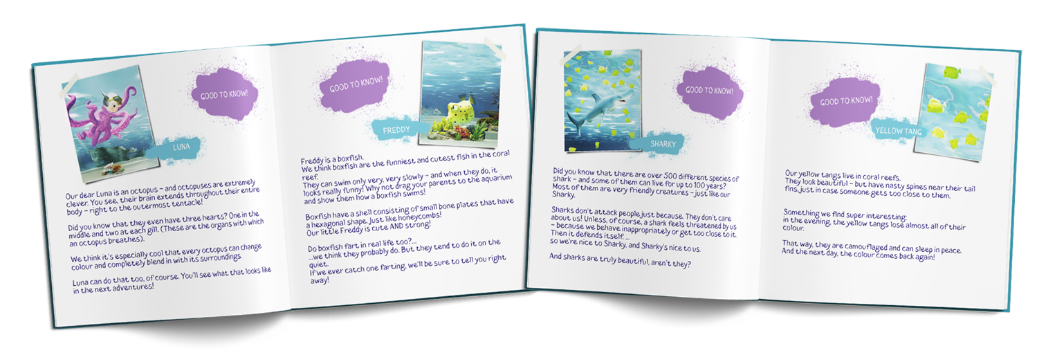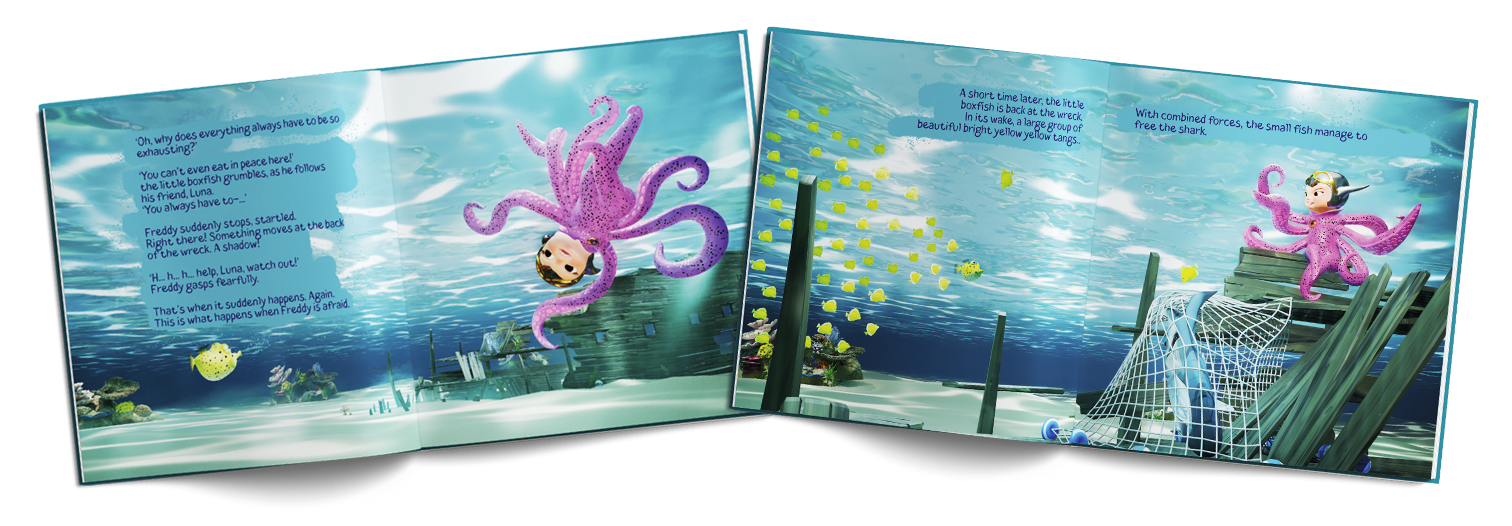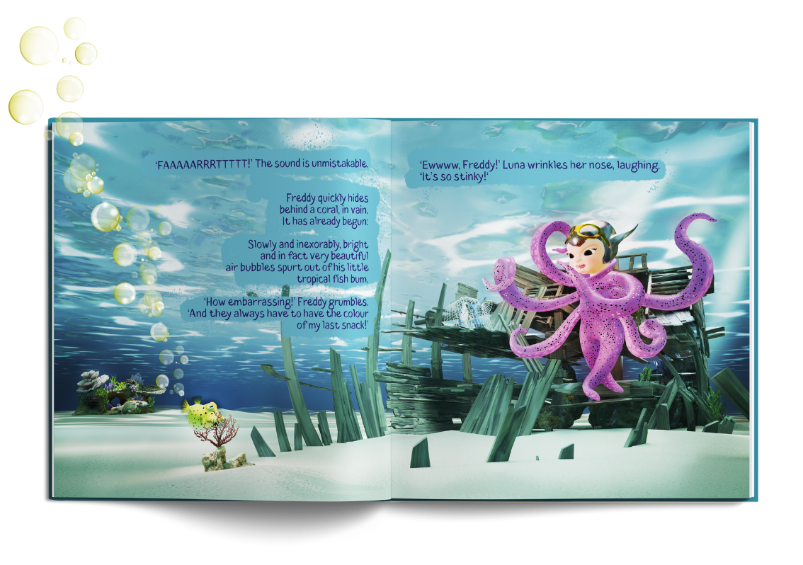 And of course, as they are under water, Freddy’s farts are little air bubbles rising from his bum. And those bubbles change color - depending on what he has eaten before.
